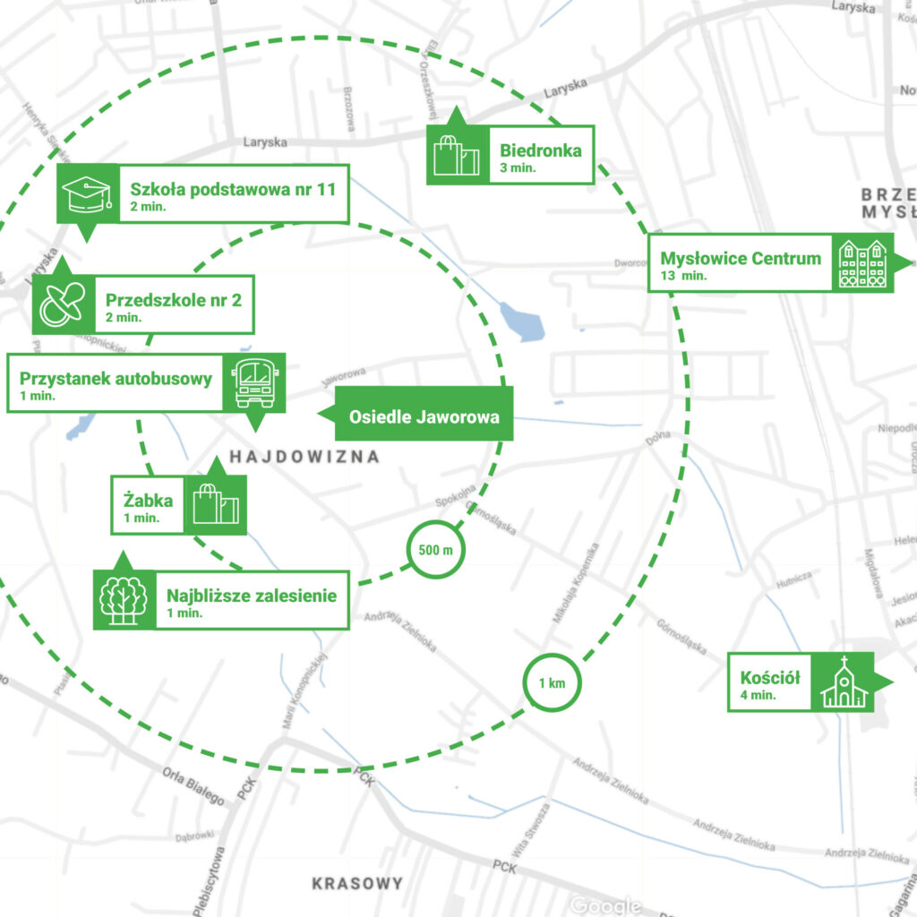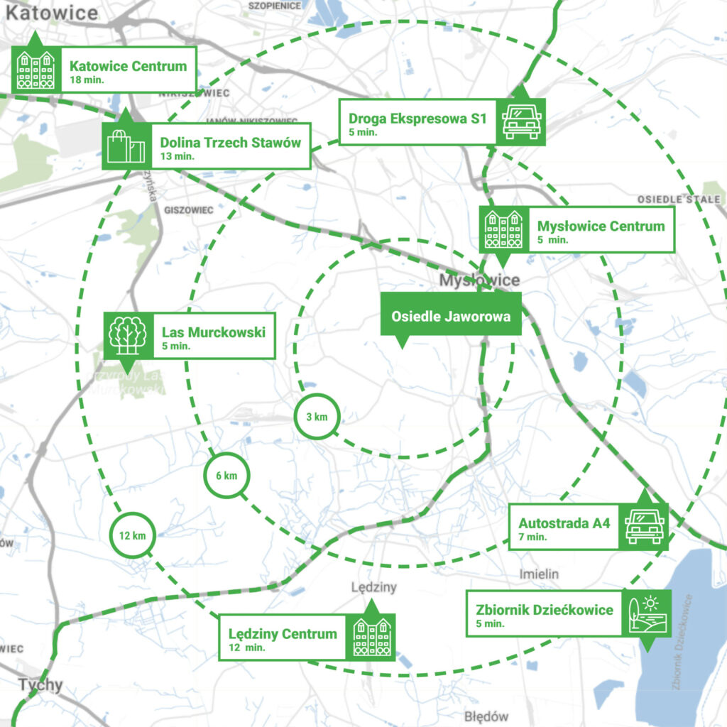Otoczenie zieleni, kojąca cisza, spokój oraz komfortowy dostęp do pełnej infrastruktury to tylko kilka z licznych atutów lokalizacji, w której znajdują się Osiedle Jaworowa. Inwestycja jest położona przy ul. Jaworowej w Mysłowicach, ok. 8 kilometrów od ścisłego centrum tej miejscowości i ok. 15 km od serca Katowic. To idealny wybór dla osób, które pracują lub uczą się w jednym z dużych śląskich miast i chcą na co dzień korzystać z bogatej oferty handlowo-usługowej, rozrywkowej, sportowej czy kulturalnej całej aglomeracji.