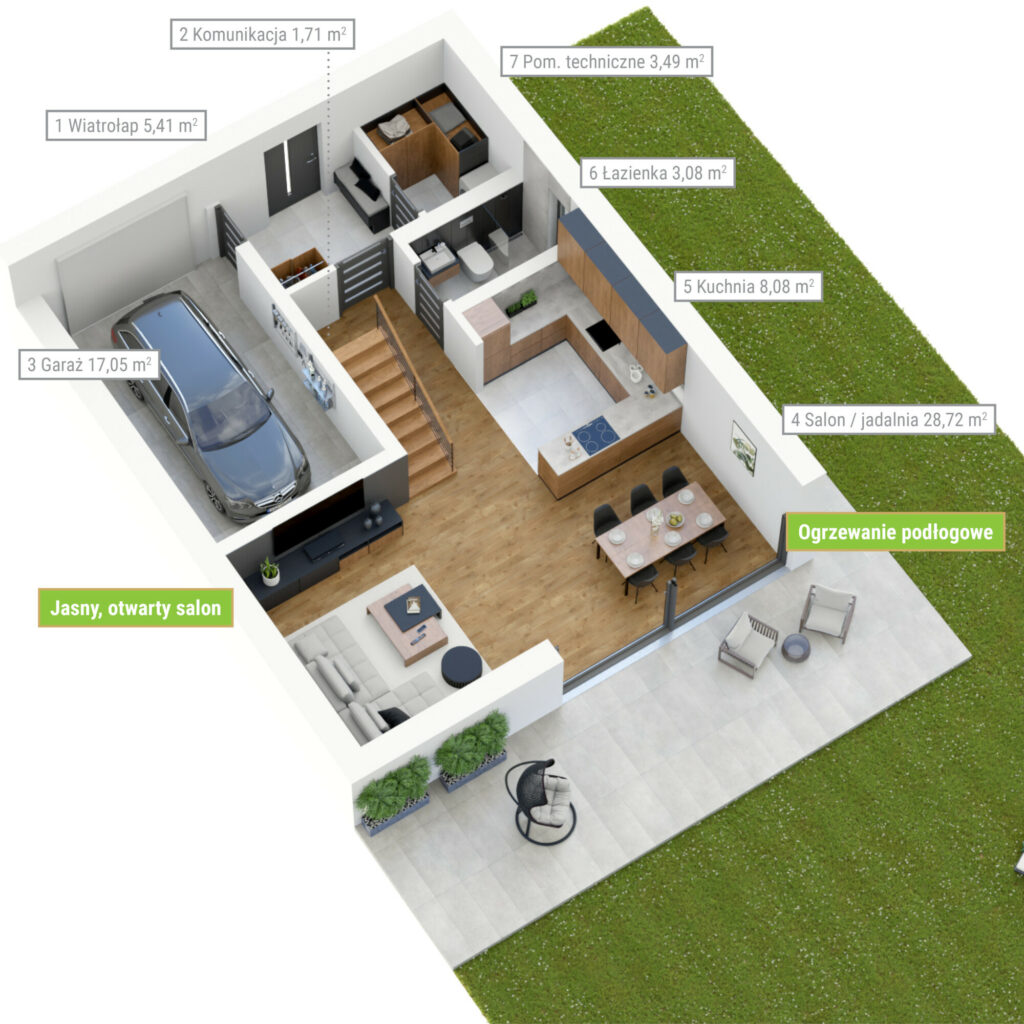 Na parterze mieści się przestronny salon z jadalnią oraz otwartą kuchnia, wiatrołap, łazienka i pomieszczenie techniczne.